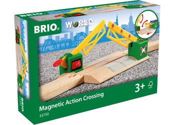 Road traffic is stopped through the power of magnetism when a train is passing. Push down to lift the bar and let the cars cross.