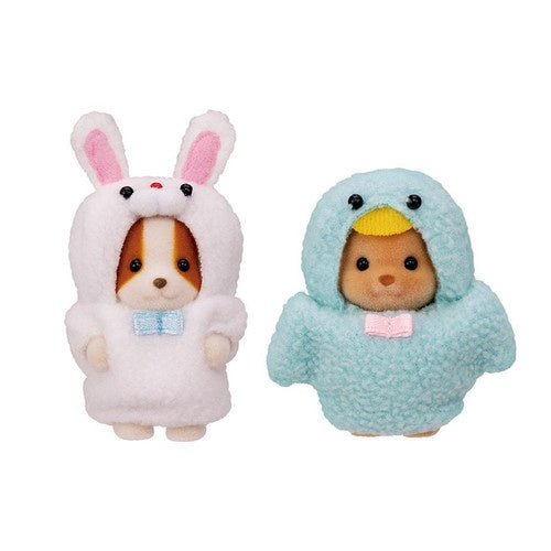These two little Sylvanian Families babies (Chiffon Dog and Toy Poodle) are wearing fuzzy animal costumes in the shape of a white rabbit and a bluebird!