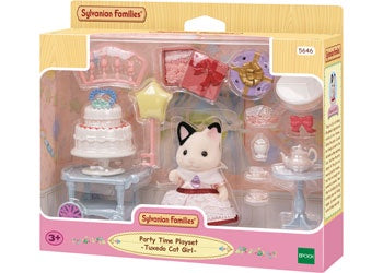 The Party Time Playset includes Lily Marlowe the Tuxedo Cat figure in an exclusive party dress, plus a lavish two-tier cake and presents.